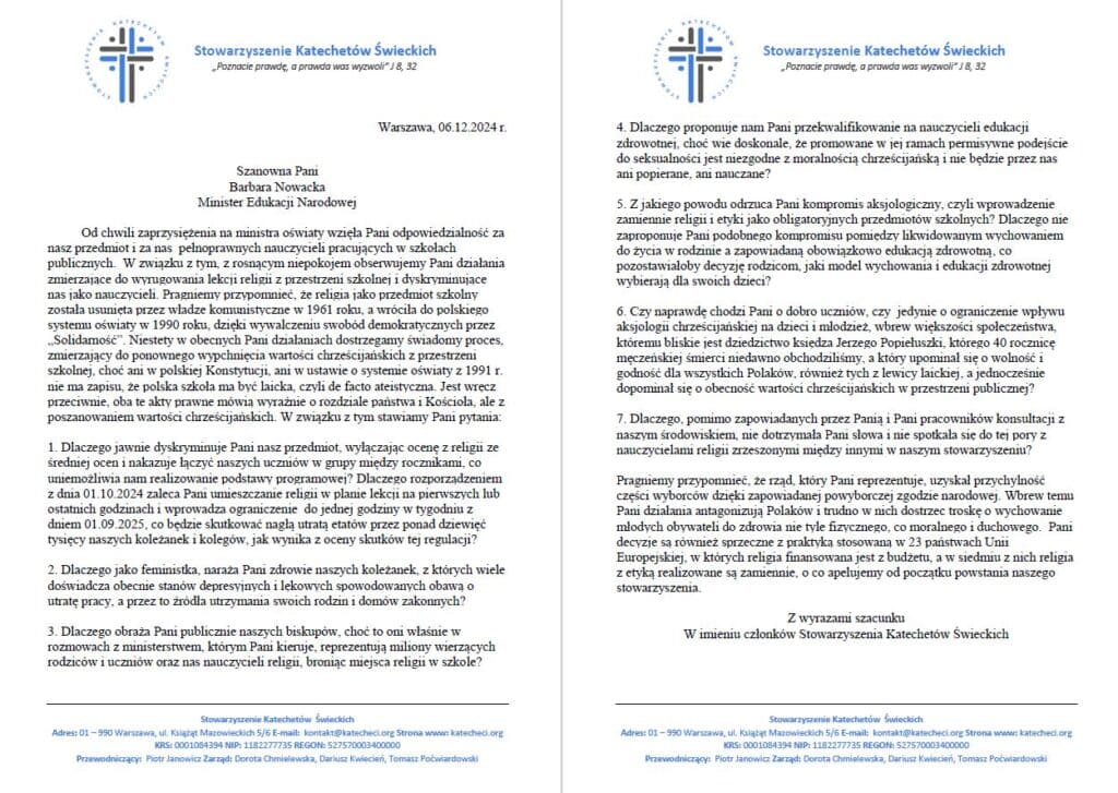 Minister Edukacji NarodowejOd chwili zaprzysiężenia na ministra oświaty wzięła Pani odpowiedzialność za nasz przedmiot i za nas pełnoprawnych nauczycieli pracujących w szkołach publicznych. W związku z tym, z rosnącym niepokojem obserwujemy Pani działania zmierzające do wyrugowania lekcji religii z przestrzeni szkolnej i dyskryminujące nas jako nauczycieli. Pragniemy przypomnieć, że religia jako przedmiot szkolny została usunięta przez władze komunistyczne w 1961 roku, a wróciła do polskiego systemu oświaty w 1990 roku, dzięki wywalczeniu swobód demokratycznych przez „Solidarność”. Niestety w obecnych Pani działaniach dostrzegamy świadomy proces, zmierzający do ponownego wypchnięcia wartości chrześcijańskich z przestrzeni szkolnej, choć ani w polskiej Konstytucji, ani w ustawie o systemie oświaty z 1991 r. nie ma zapisu, że polska szkoła ma być laicka, czyli de facto ateistyczna. Jest wręcz przeciwnie, oba te akty prawne mówią wyraźnie o rozdziale państwa i Kościoła, ale z poszanowaniem wartości chrześcijańskich. W związku z tym stawiamy Pani pytania: